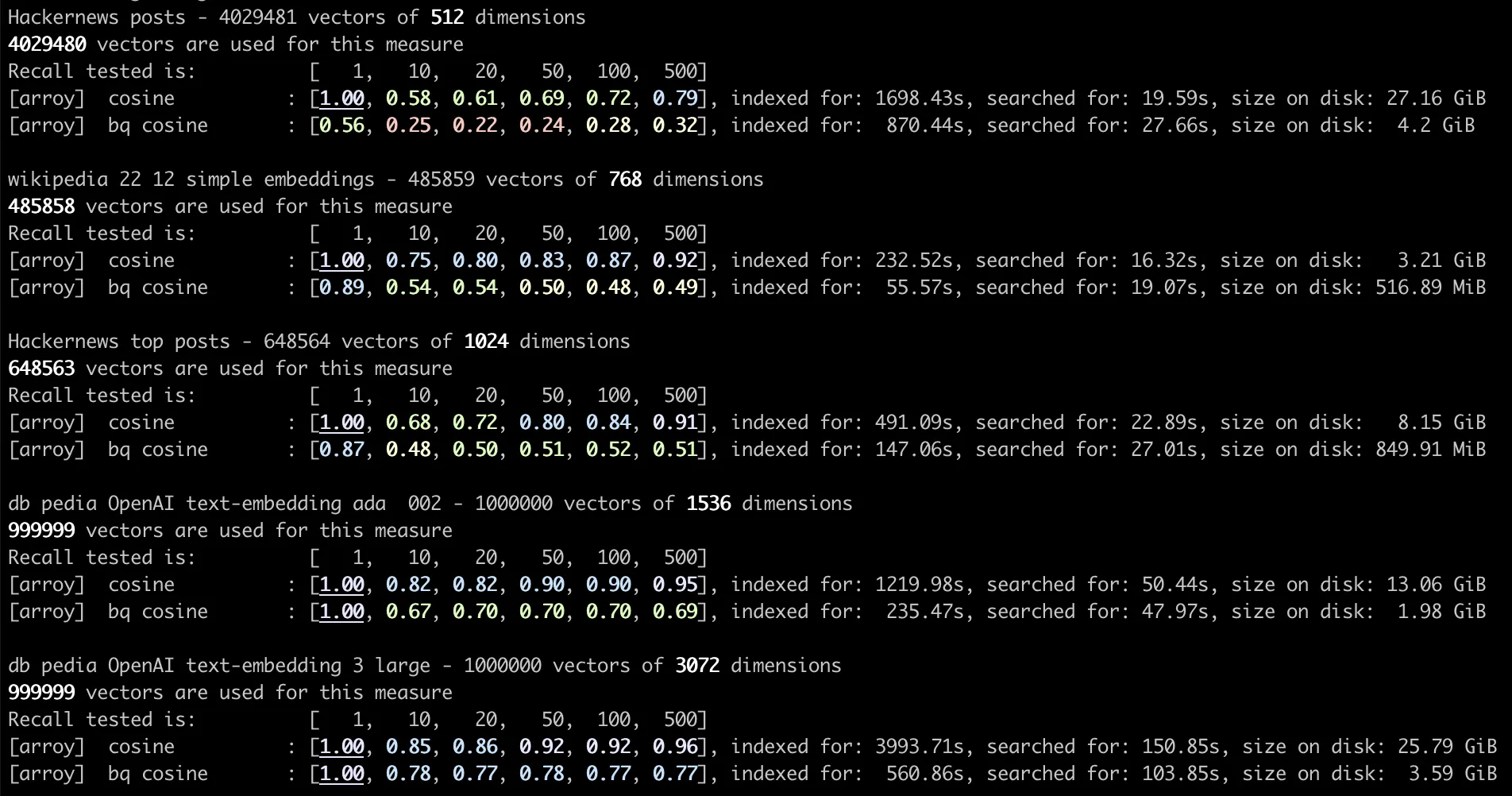 We recommend using Meilisearch/arroy's binary quantization feature for OpenAI users with large embeddings. In an upcoming article, we will compare Meilisearch/arroy with competitors, focusing on our Filtered DiskANN feature. Stay tuned!