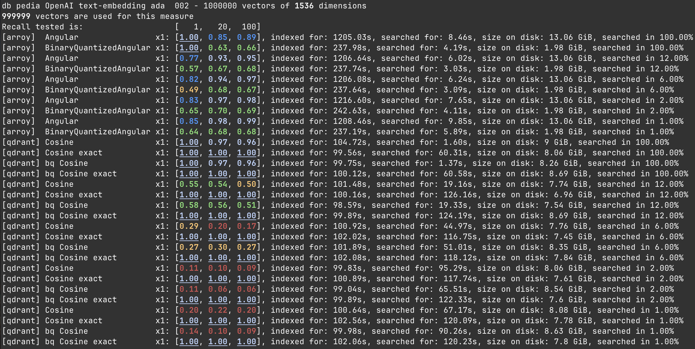 | Qdrant Binary Quantized | 1.00 | 0.97 | 0.96 | 99s | 13ms | 8 GiB |