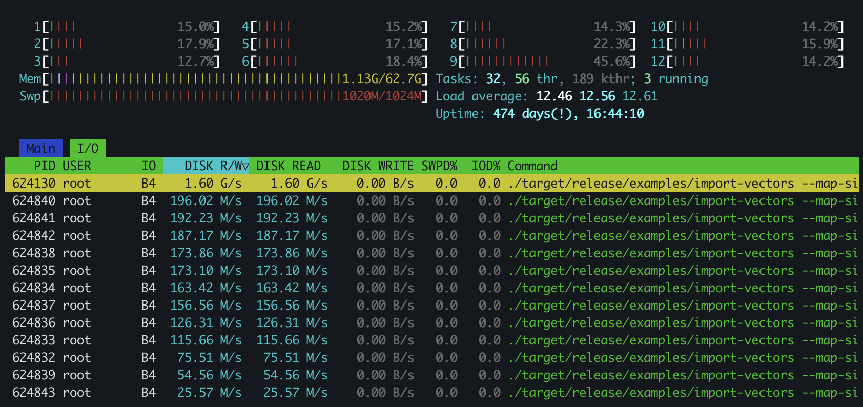 But... Annoy cannot index this same number of documents. It suffers from the same issue we saw before: high disk read and low CPU usage. But why? I needed clarification because the nodes have the same format, the number of item vectors to index is the same, and the algorithm has been ported. So, what is the difference between both solutions?