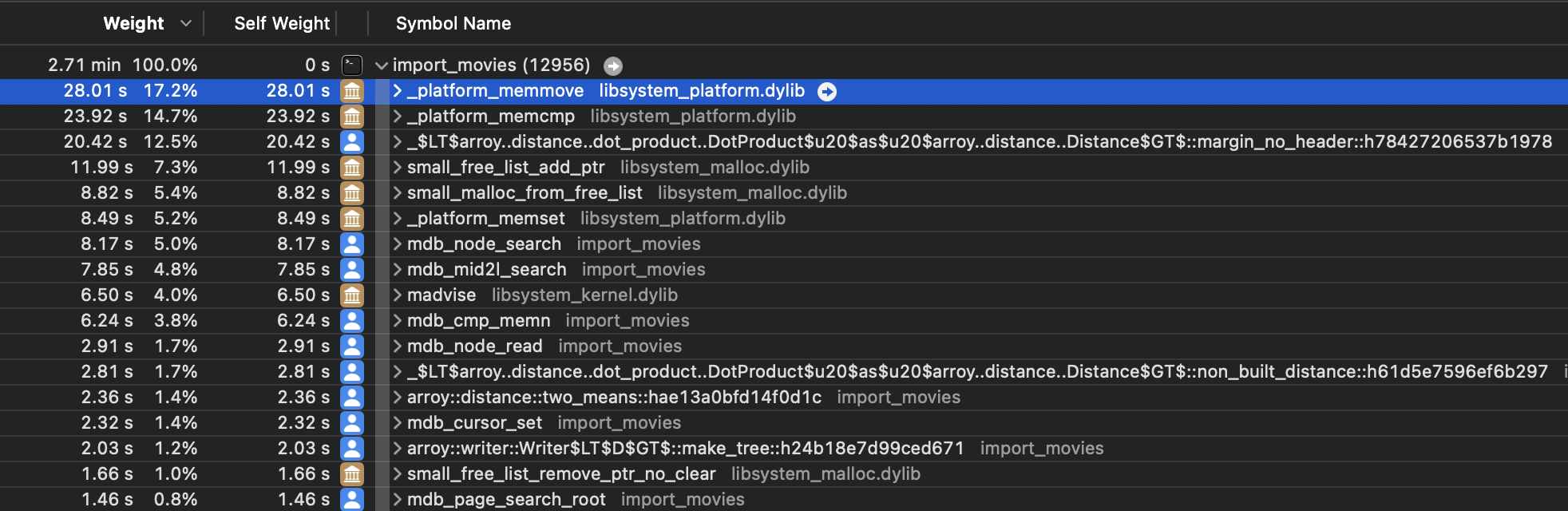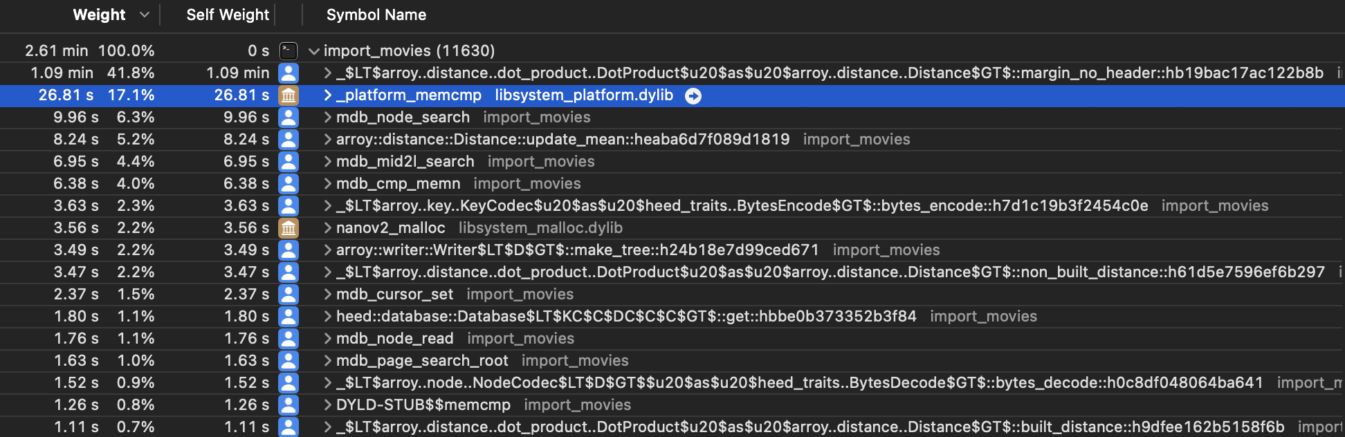 Similarly to the memmove calls, we can see that the _platform_memcmp function is taking a lot of space here. The reason is that LMDB uses this standard function to compare key bytes and decide whether a key is lexicographically located above or below another key in the tree. It is used whenever we read or write in LMDB. @irevoire drastically reduced the size of the keys and saw an important gain in performance. We further tried using the MDB_INTEGERKEY, which makes LMDB compare memory using the computer endianness, but it was complex to use and not showing significant performance gains.